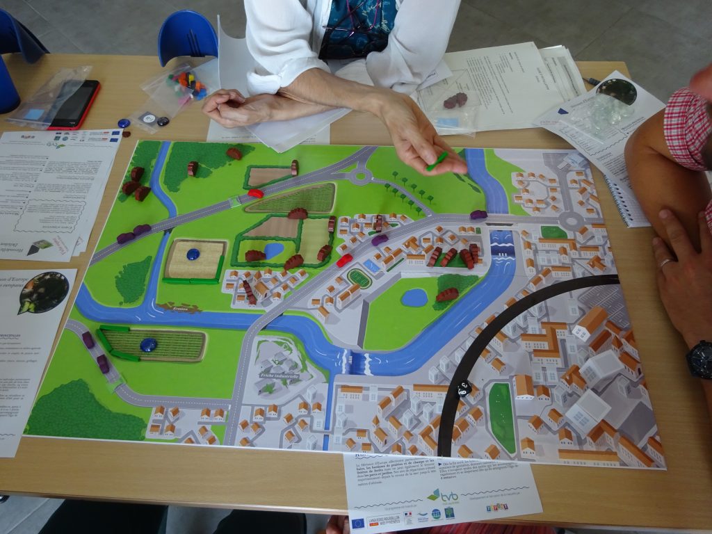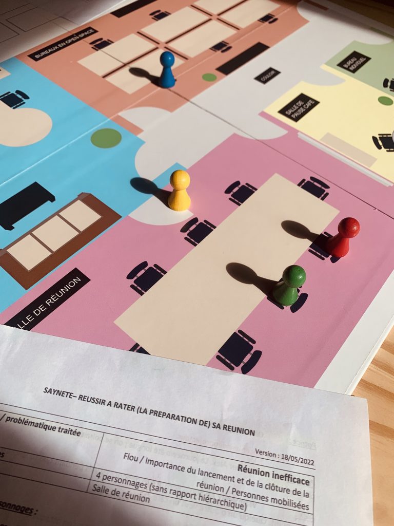 Le principe : Une scène de théâtre courte (saynète), jouée par les stagiaires assis autour d’une table, en déplaçant des pions sur un plateau de jeu.